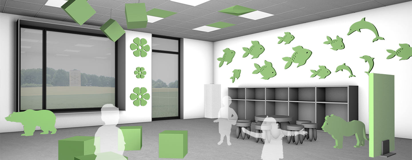 In many areas - whether in the office, kindergarten, school, meeting room - there is a significant increase in noise levels. This is due to modern architecture with highly reflective surfaces of floors, ceilings and walls. The result is high sound levels and poor speech intelligibility, which cause fatigue and impair performance. To reduce sound levels, we recommend that our customers install sound absorbers on the ceiling or in the upper wall area. Depending on the requirements for appearance or stability, various products can be considered as sound absorbers. For good room acoustics and a reduction in reverberation, partial cladding is usually sufficient. Approximately 30 - 50 % of the floor area of a room is recommended for this purpose, depending on the room height and the initial sound level. This measure significantly reduces the reverberation time and thus the sound level. This increases speech intelligibility, which makes a room much more pleasant for people.