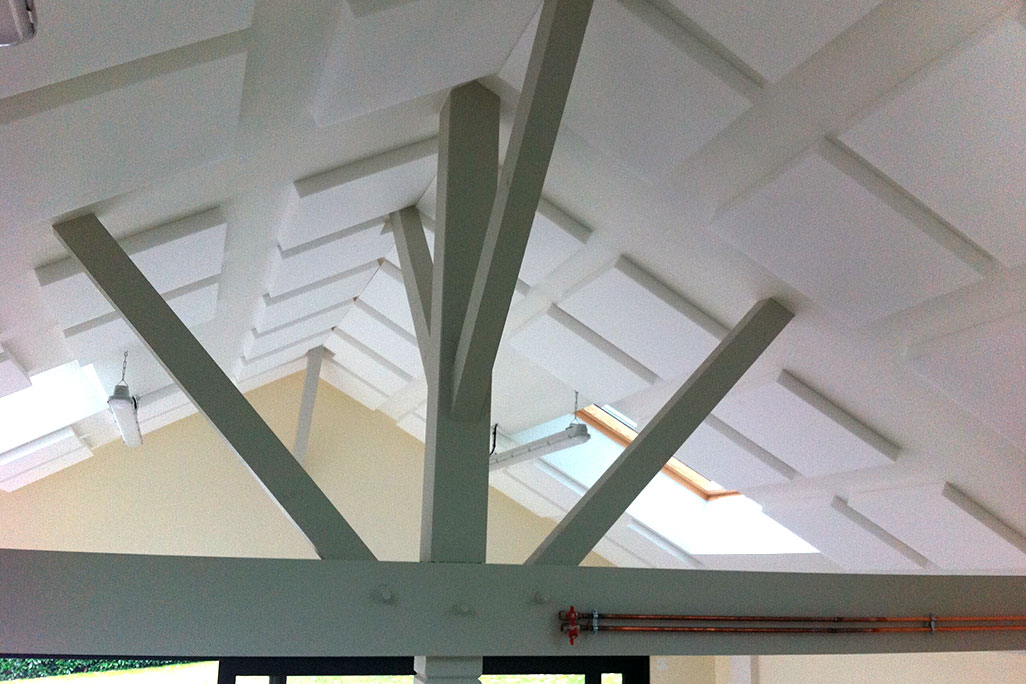 Náš obývací pokoj je vybaven tvrdou podlahou a jen několika kusy nábytku a téměř žádnými textiliemi, závěsy. Z toho plynoucí vysoká míra dozvuku způsobovala, že byl velmi nepříjemný a hlučný, zejména když bylo přítomno více lidí. Nyní, když jsme nainstalovali 30 mm silné zvukově absorpční panely soni PROTECT F, se hladina hluku výrazně snížila a atmosféra je mnohem příjemnější. Pomocí speciálního lepidla soniflex bylo upevnění panelů opravdu snadné. Zkosené hrany panelů soni PROTECT F umožňují velmi čisté spoje a dokonce pomáhají zakrýt nerovnosti v povrchu stropu.