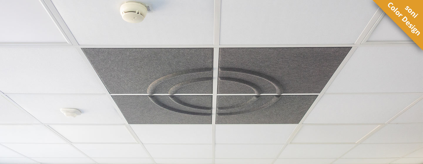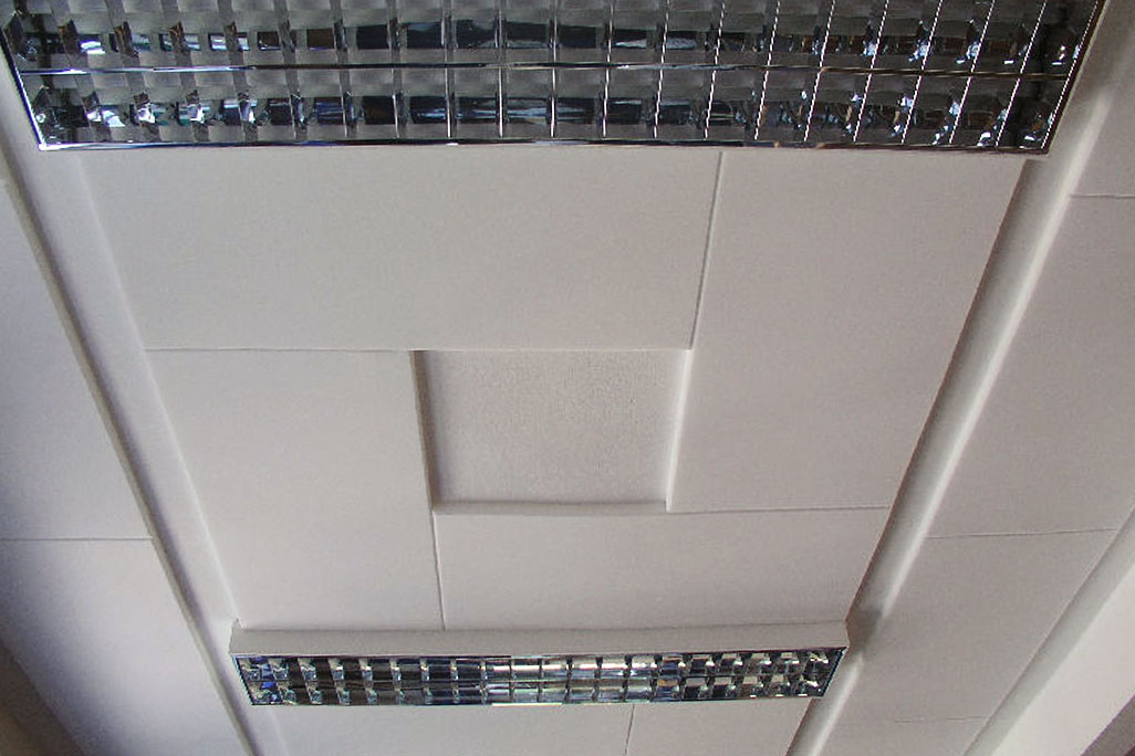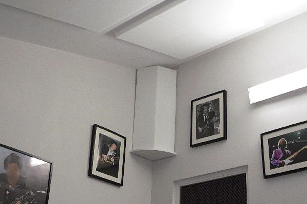 Abych doplnil vybavení svého malého soukromého nahrávacího studia, pokryl jsem část stropu akustickými panely soni PROTECT 500x500x50 mm (pozn. od firmy soniflex: v té době byly k dostání v akční nabídce) a vytvořil dekorativní vzor z řad po 4 panelech. V rozích jsem přidal akustické prvky soni TRAPEZ.