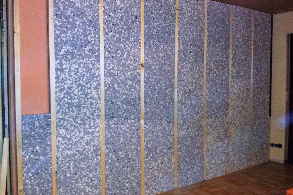 Zvukově izolační desky bylo velmi snadné vyříznout do správného tvaru a vlepit je do prostorů mezi latěmi. Protože celková tloušťka dřevěných latí plus těsnicí pásky na obou stranách byla 30 mm, nevznikla mezi sádrokartonovou deskou a akustickou pěnou žádná mezera a celková tloušťka byla dokonce nižší než maximální tloušťka 50 mm.