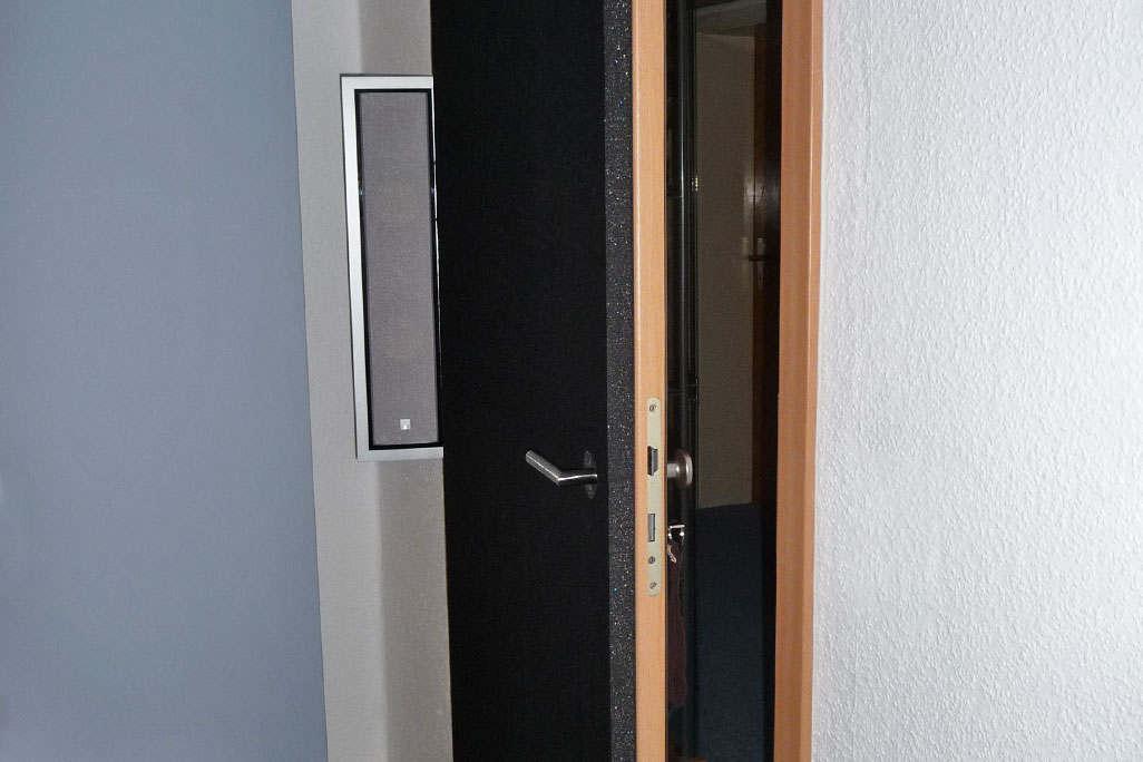 Řešení: vrstva zvukově izolačních desek soni COMPOSITE o tloušťce 32 mm nalepená na dveřní křídlo ve spojení s dodatečnou těsnicí páskou aplikovanou mezi dveřní křídlo a zárubeň, jak doporučila společnost soniflex, přinesla velmi dobrý zvukově izolační výsledek. Nyní si mohu užívat sledování filmů v domácím kině bez nebezpečí, že budu obtěžovat sousedy - ti už nic neslyší.