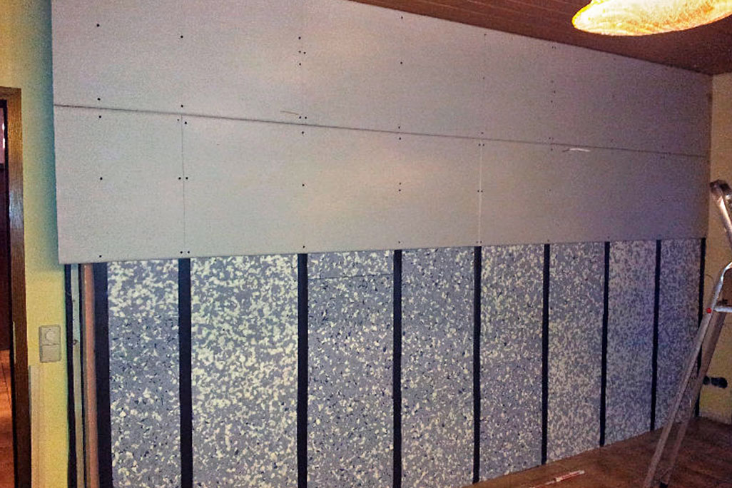 Na základě rad, které nám společnost soniflex poskytla e-mailem, jsme objednali 10 m² (asi 110 čtverečních stop) protihlukových panelů soni COMPOSITE 32 mm a nalepili je na stěnu, kterou jsme předtím vyhladili hladicí hmotou. Samolepka na zadní straně panelů fungovala naprosto dokonale! Poté jsme pomocí šroubů o délce 6 cm (2,5 palce) namontovali přes zvukově izolační panely po celé délce stěny rám z dřevěných latí. Na tento rám jsme pak připevnili sádrokartonové desky, což umožnilo dosáhnout téměř dokonale vyrovnané “závěsové stěny”. Mezery na vnějších okrajích jsme uzavřeli bílým akrylátovým tmelem ze stavebnin. Po 24 hodinách vytvrzení jsme nanesli další vrstvu vyhlazovací hmoty, abychom zajistili dokonale rovný podklad pro vymalování. S výsledkem jsme VELMI spokojeni.