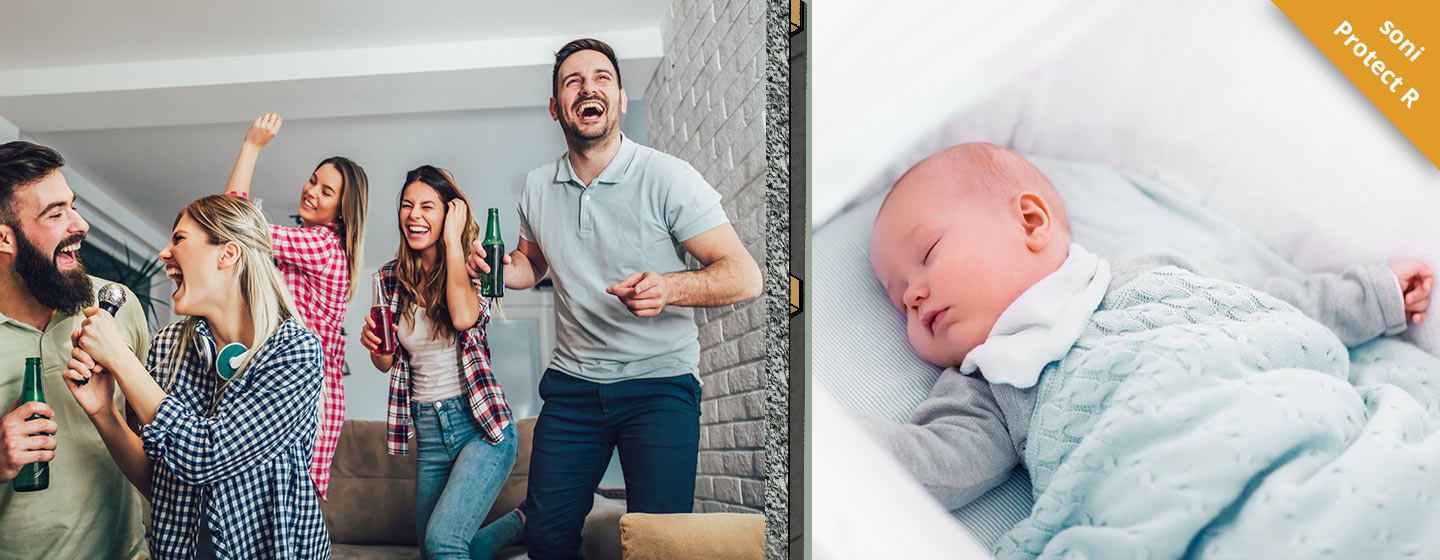 Tým soniflexu doporučil vybudovat před příčkami tzv. závěsové stěny, které by odclonily hlasy a další zvuky šířící se vzduchem ze sousedního bytu. Pro takovou závěsovou stěnu se na stěnu připevňuje kostra z dřevěných lamel o tloušťce 30 až 50 mm, nejlépe na pružných distančních podložkách, aby bylo zajištěno akustické odrušení. Do prostor mezi lamelami se pak namontují zvukově izolační desky soni PROTECT R. V posledním kroku se na rám z lamel pomocí šroubů připevní sádrokartonové nebo dřevotřískové desky. Ještě lepšího zvukově pohltivého účinku se dosáhne, když se zvukově ochranný materiál, zde soni PROTECT R, nepřipevní přímo na stěnu, ale na dřevěné lamely (30 mm) před montáží stěnových desek.